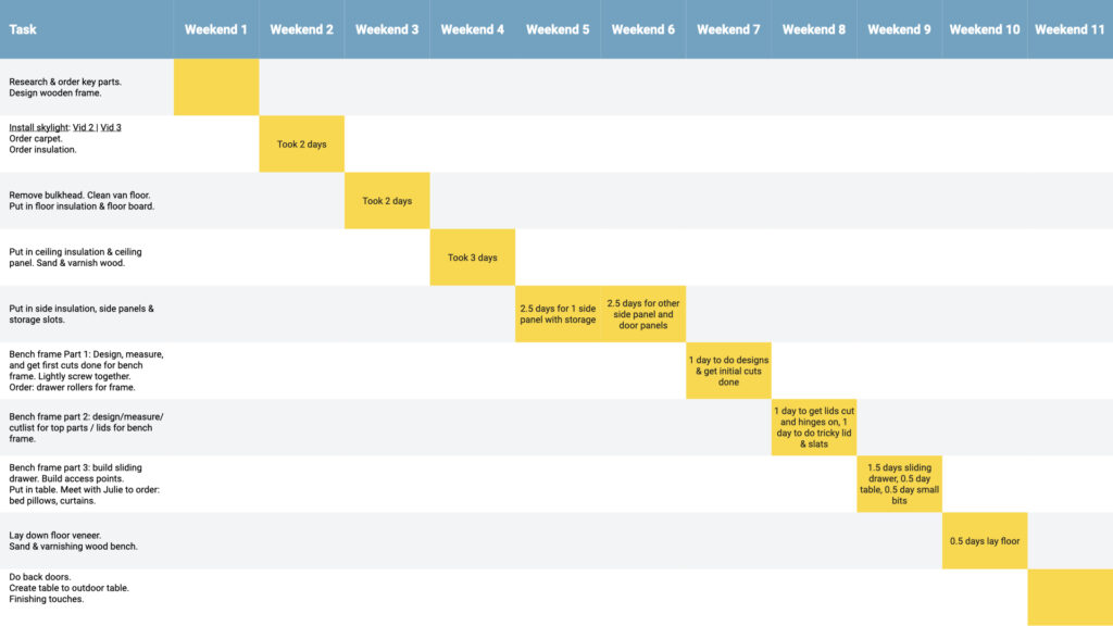 - Define your total budget – mine was 10k (8k for van, 2k for build).