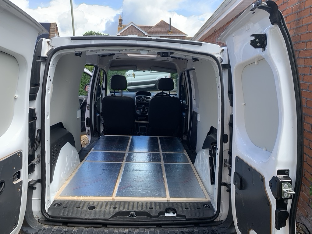 3. Remove bulkhead. Clean van floor. Put in floor insulation & floor board.